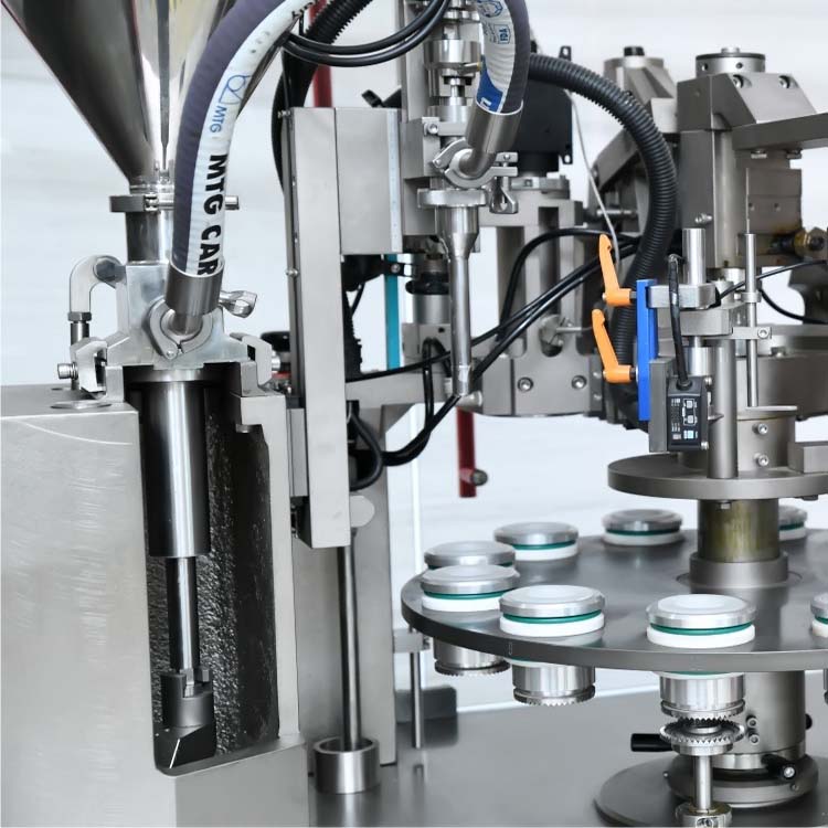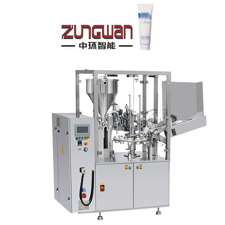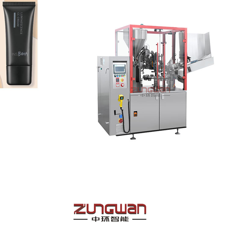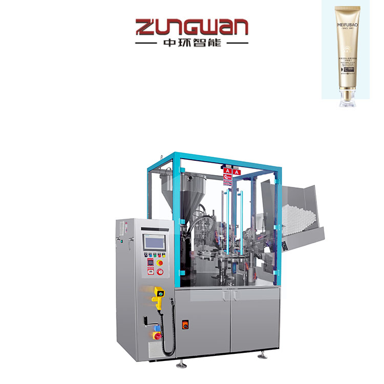 工作流程:管倉(護(hù)膚品軟管) → 自動上管(化妝品復(fù)合管) → 識標(biāo)定位 →軟管(鋁管)內(nèi)部清洗(選項)→ 充填 → (鋁塑管)尾部熱熔 → 壓合封尾、打字碼→(金屬管扁尾)→一次折疊→二次折疊→鞍形折疊→剪切(打印字碼)→成品排出。